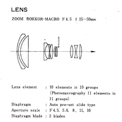 The lens is an f/4.5-f/16 25 mm-50 mm zoom macro (roughly equivalent to a 50 mm - 100 mm zoom on a 35 mm camera) with 10 elements in 10 groups. The zoom ring on the lens is marked for 25 mm, 30 mm, 35 mm, 40 mm, 50 mm and macro. The lens focuses as close as 1 meter in the normal focusing range. An 11th lens element moves into place when you turn the zoom ring to the macro setting and the camera then focuses from 30.7 cm to 28.6 cm. The lens takes 40.5 mm screw-on filters. The aperture is manually set by a dial surrounding the CdS light sensor.